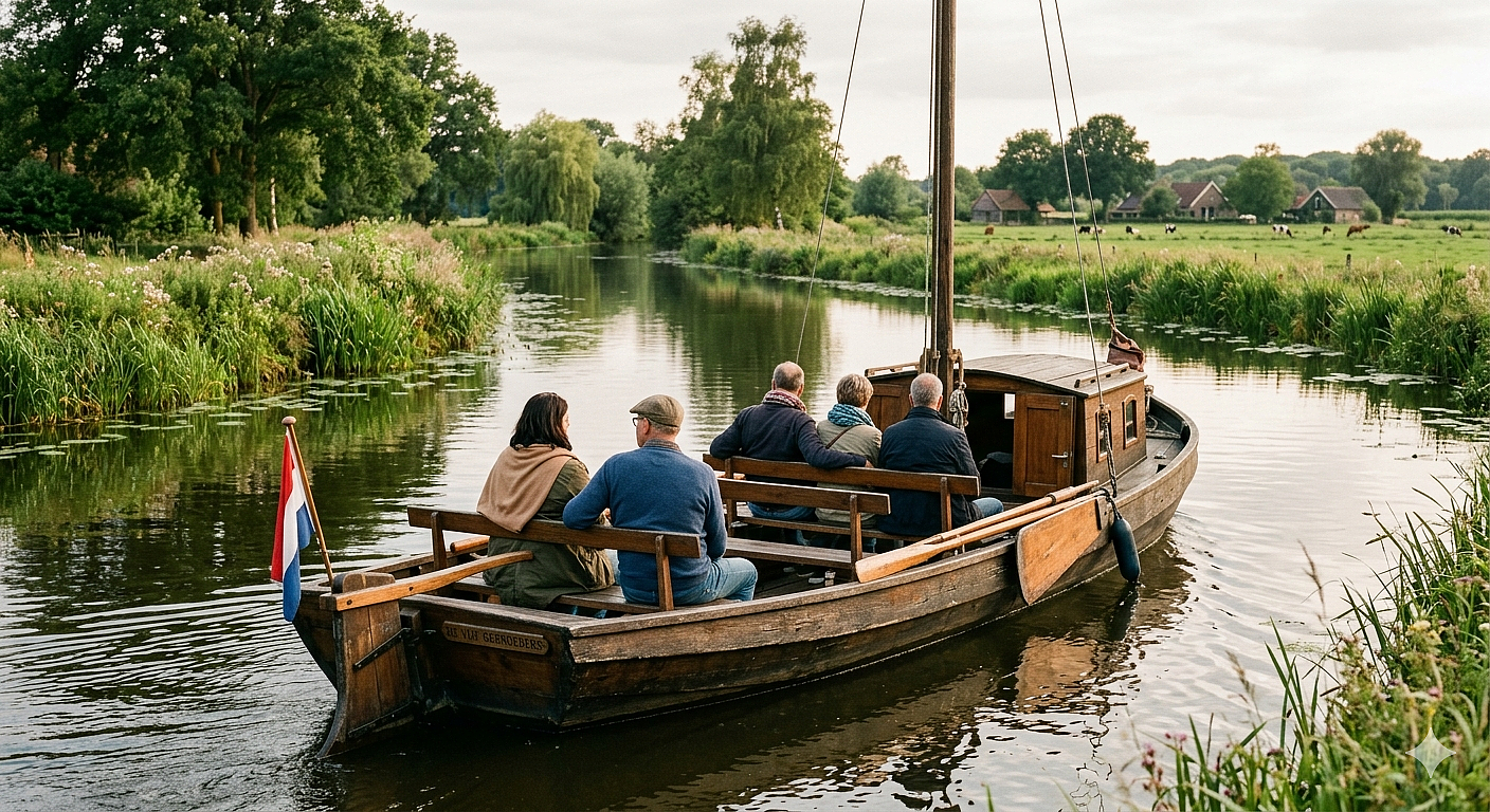 De Enterse Zomp, een traditionele platbodem, neemt de groep mee op een reis door de schilderachtige wateren van de Regge.